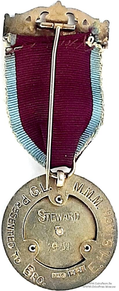 РЕВЕРС: надпись: Presented to Bro. E.H. Birch G.L.M.M.M. Вручён Брату E.H. Birch Великой Ложей Масонов Мастеров Метки 1951. Клейма: GK&S, якорь, лев, J (1958??). На центральной части – лев.