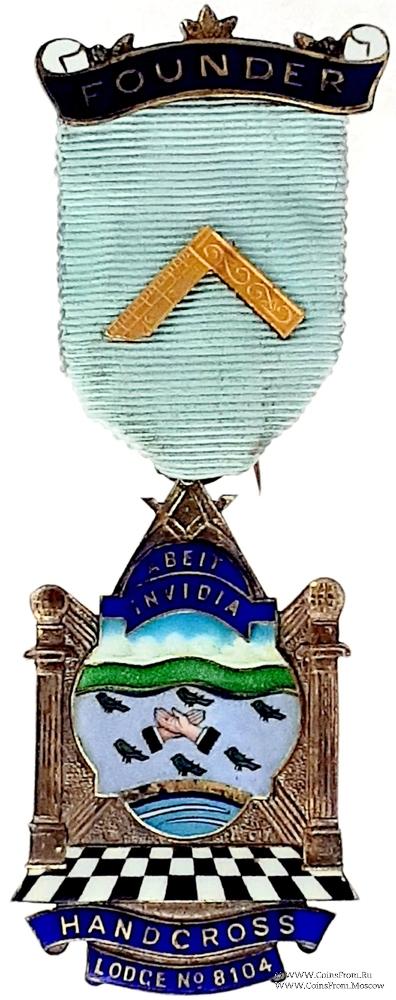 АВЕРС: с боков символические колонны, вверху соединённые циркулем с наугольником. Под наугольником на ленте надпись на латыни Abeit Invidia. В центре картина по эмали, основа которой изображение 6 птиц на голубом фоне (символ провинции West_Sussex - графство на юге Англии). В нижней части изображение традиционного для Лож пола в чёрно - белую клетку. Низ знака украшает лента синей эмали с наименованием и номером Ложи - Hand Cross Lodge № 8104