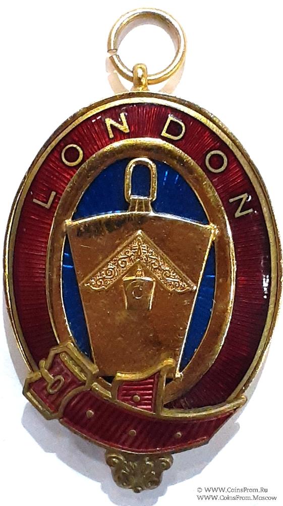 Аверс: знак Провинциального Мастера Метки, получившего Высший Лондонский Ранг. Овал – подвязка красной эмали с надписью в верхней части LONDON. В центре на синем лучистом фоне из стекла накладной замковый камень, на котором изображение наугольника с подвеской в форме замкового камня.