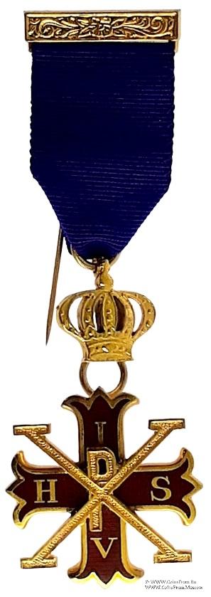 Знак в форме креста красной эмали. Концы в виде трилиcтника на лучах креста буквы IHSV (IHSV – IN HOS SIGNO VINCES (латынь) - «Сим (знаком) победеши»). Сверху креста накладтая буква Р и Х. Крест к лентте крепится через двухсторонюю корону.