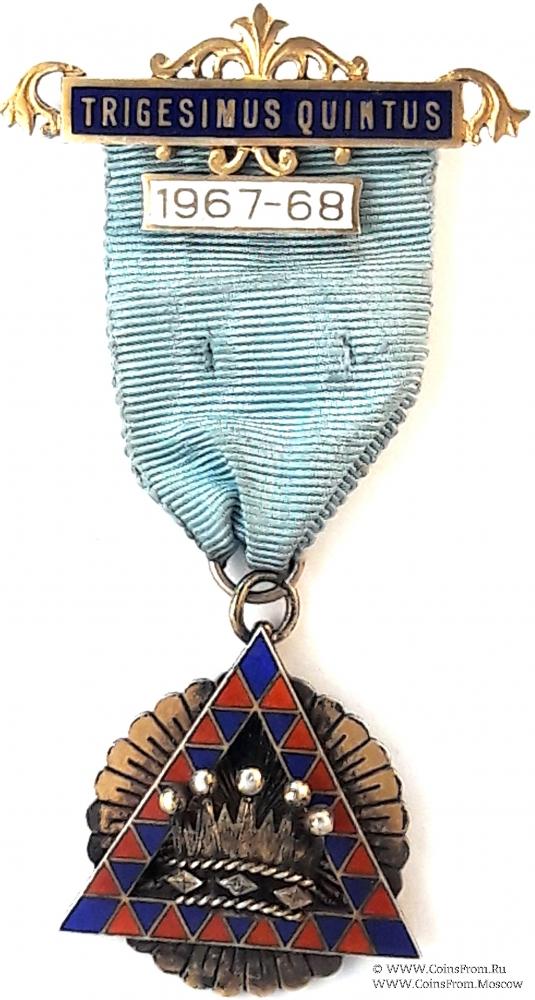 Лента знака «не родная». Должна быть красного цвета. Голубая лента от знака «прошлому Мастеру» символической Ложи с надписью тридцать пятый и годы работы 1967-68.