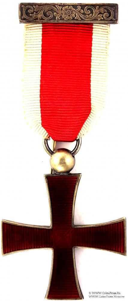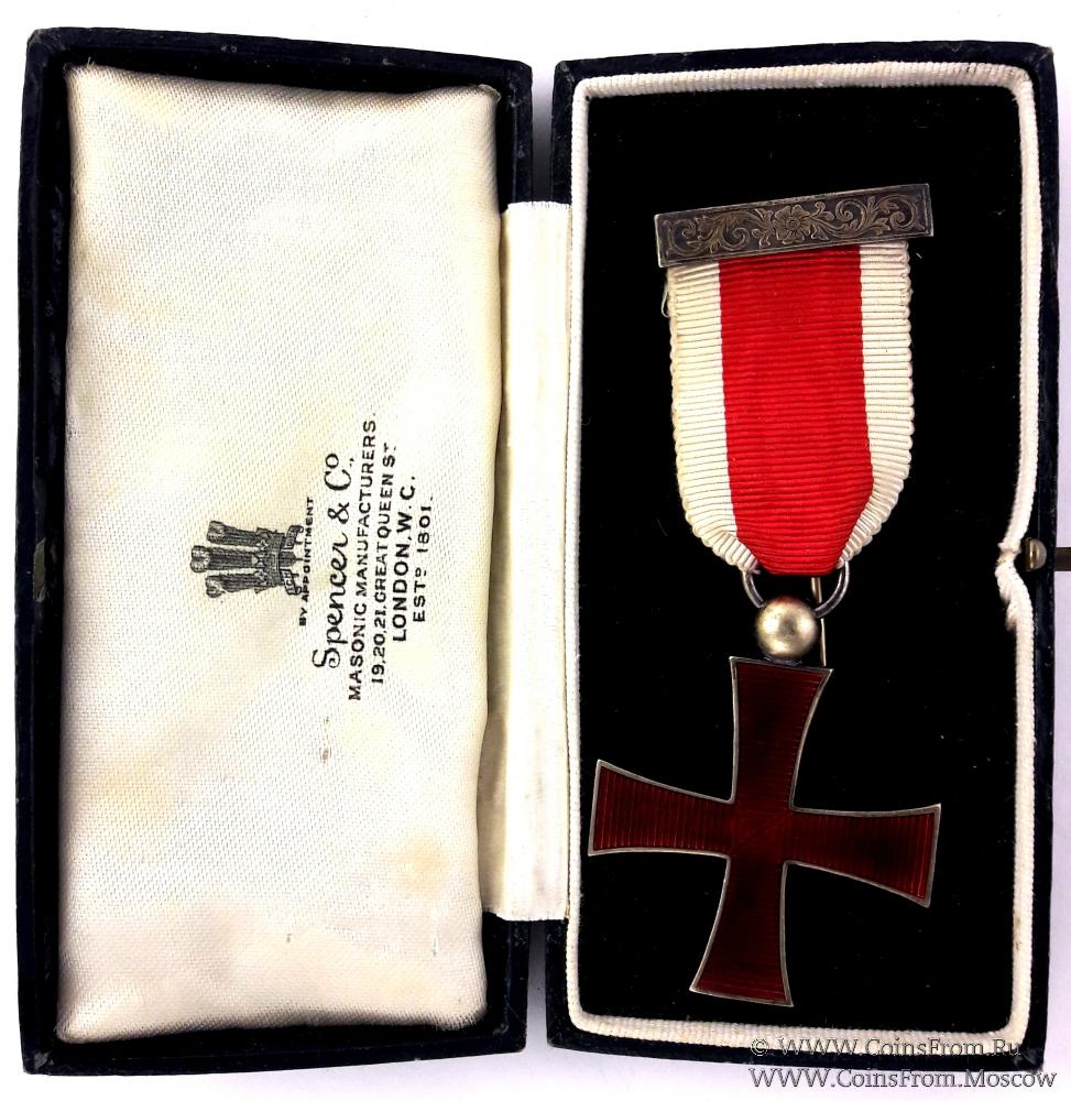 Знак Рыцаря в форме традиционного креста красной эмали. Ношение его обязательно на всех встречах Рыцарей. Лента знака красная с белыми полосами по бокам. Верхняя колодка прямоугольная с орнаментом.