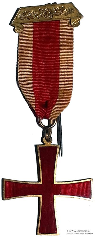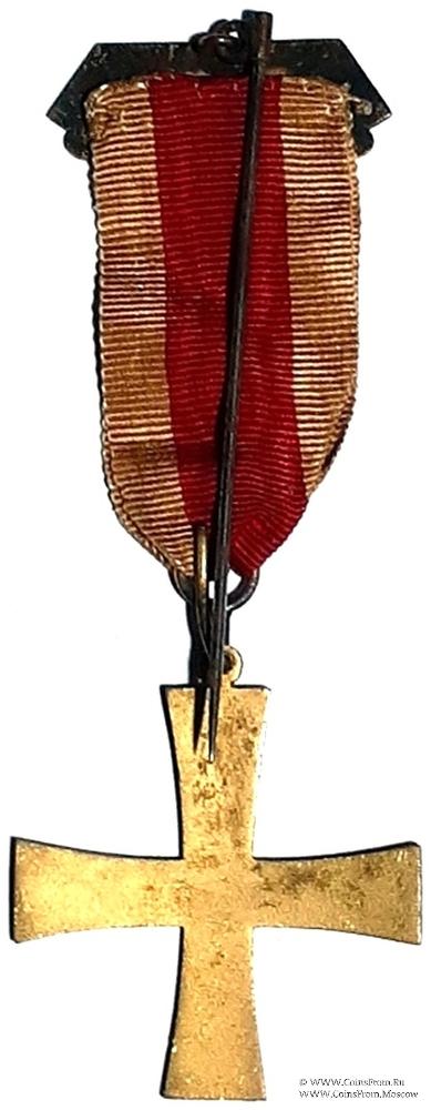 АВЕРС: гладкий красной эмали в форме традиционного креста. Кольцо для крепления вы-полнено заодно с крестом. Линии под эмалью вертикальные по всему знаку. Ширина креста 40 мм, луча на конце 10 мм.