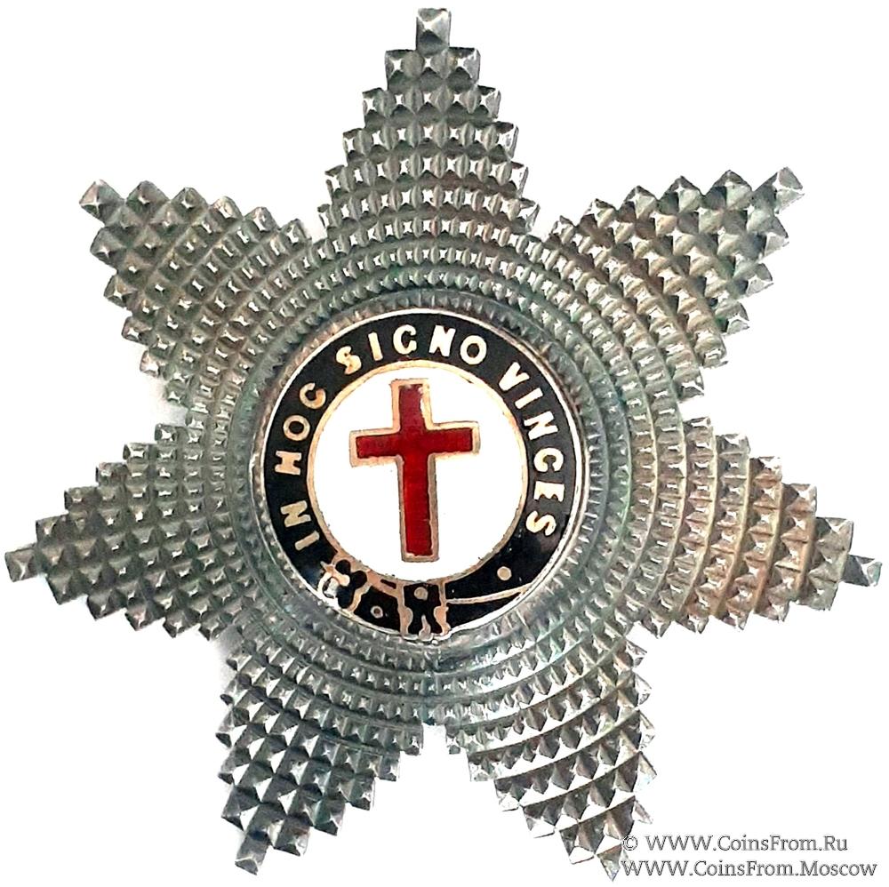 Аверс: 7 конечная звезда. В центре накладной круг из подвязки чёрного цвета с надписью IN HOC SIGNO VINCES (латынь) - СИМ ПОБЕДИШИ. Нижний конец подвязки заканчивается золочёным орнаментом. В центре подвязки «Латинский» крест (с одной перекладиной) красной эмали.