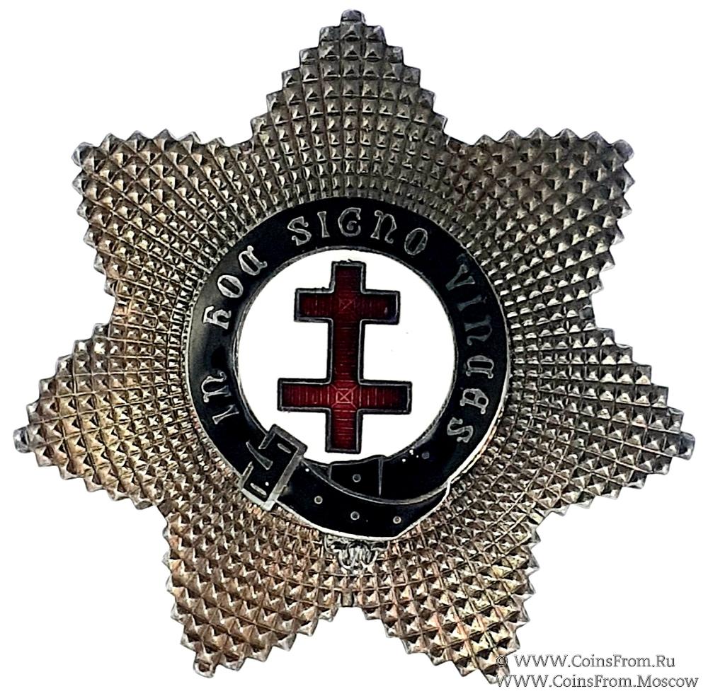 АВЕРС: 7-ми конечная звезда. В центре накладной круг из подвязки чёрного цвета с надписью IN HOC SIGNO VINCES (латынь) - "СИМ ПОБЕДИШИ". Нижний конец подвязки направлен вдоль круга. В центре круг белой эмали с изображением красного «Патриаршего» креста (с двумя перекладинами).