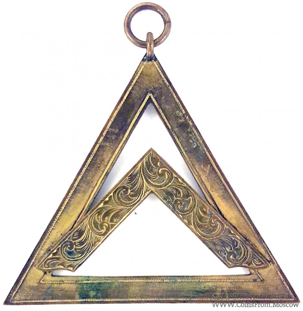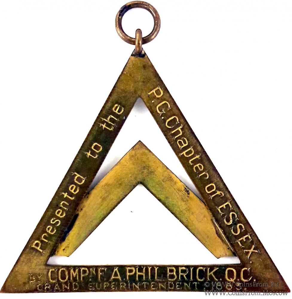 Должностной знак офицера Королевской Арки ASSISTANT SOJOURNER в форме треугольника с накладным наугольником. Гравировка на реверсе знака: Presented to the P.G. (Provincial Grand) Chapter of Essex - Вручён провинциальным Велдиким Капитулом Эссекса. Companion F. A. Phil Brick Q.S. Grand Superintendent 1883 - Компаньону F. A. Phil Brick Q.C. Великий Суперинтендант.
