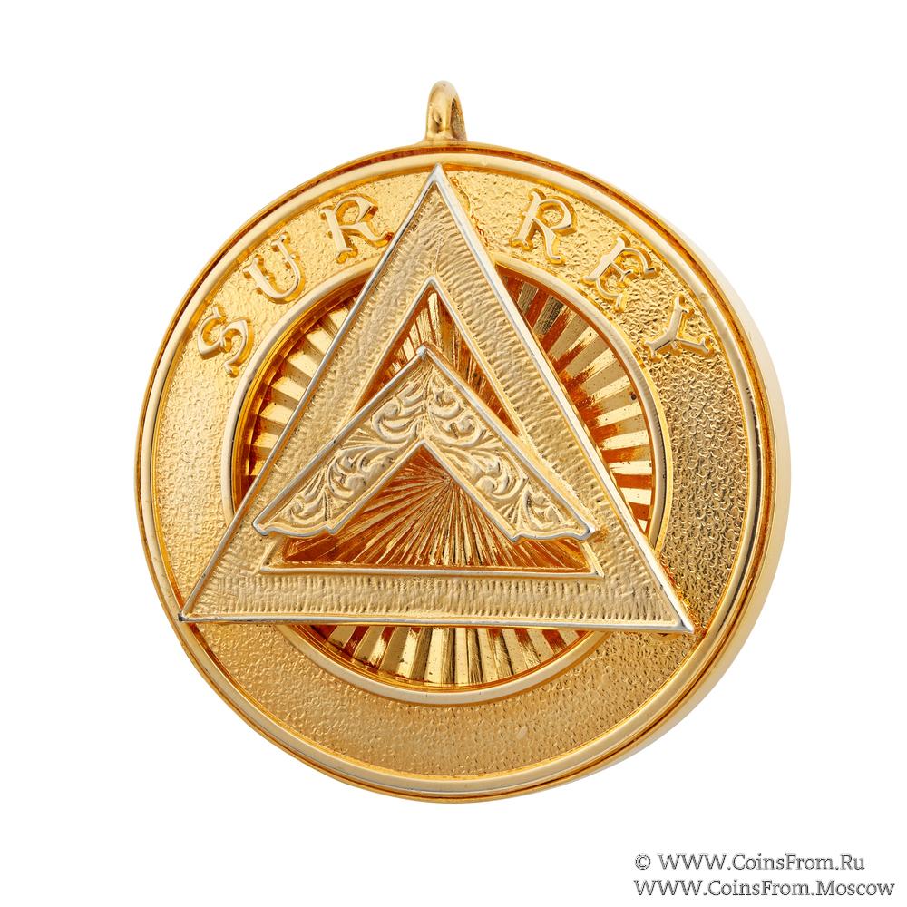 Знак круглой формы в золотом кольце наименование провинции, внутри сияющие лучи на фоне которых наложен равносторонний треугольник с наложенным наугольником. В верхней части по кругу наименование провинции SURREY.