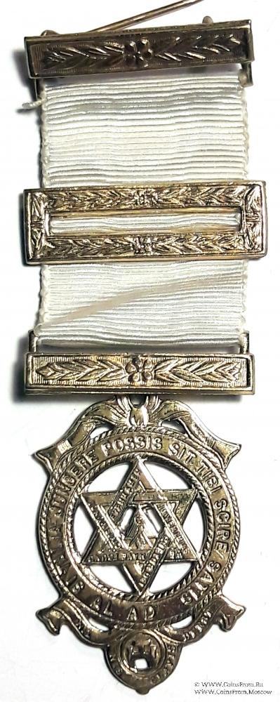 Круг с надписями на латыни. В круге гексаграмма в гексаграмме треугольник, циркуль. Ниже в ленте символ Королевской Арки - в круге тройное тау.