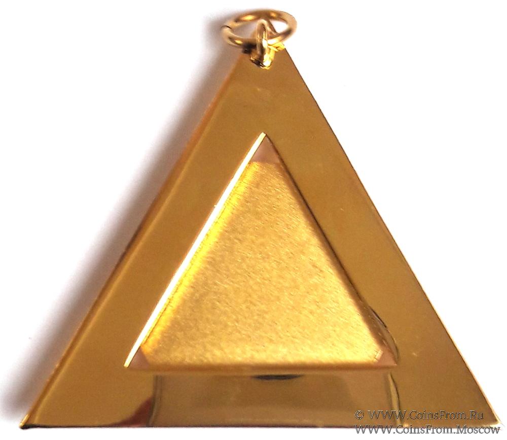 Аверс: треугольной формы. Размер стороны 65 мм. На двойном равностороннем треугольнике накладной круг с лучистым фоном, на котором раскрытая книга - эмблема должности Третьего Принципала.