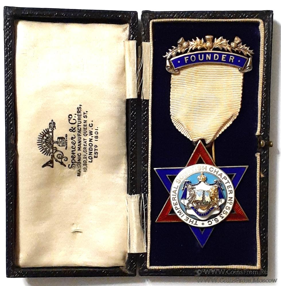 Аверс: в форме шести конечной звезды, образованной двумя, синим и красным, треугольниками. Накладной круг с надписью на белом фоне S.C.+The Imperial Scottish Chapter №553. В центре на голубом фоне двухслойное накладное изображение большого герба (щит, два щитодержателя (единорог и лев), девизная лента с (надписью RA Chapter), мантия, корона).