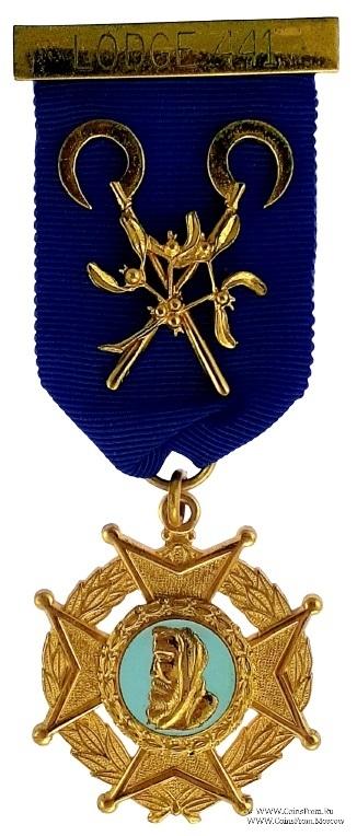КОЛОДКИ/МЕДАЛЬОН: верхняя колодка прямоугольная с номером Ложи – Lodge 441. В центре ленты медальон в виде двух пересекающихся болинов, украшенных символическим растением. (болин (Boline), он же обрядовый серп, серп друидов — ритуальный нож, предназначенный для срезания трав, вырезания магических символов и прочее).