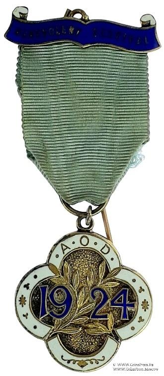 АВЕРС: в виде четырёх лепесткового цветка. В двойной полосе белой эмали аббревиатура Ордена AOD и символические изображения знаков зодиака. В центре на золотом фоне ветка оливы и дата 1924.