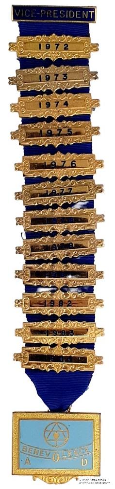 КОЛОДКИ/МЕДАЛЬОН: верхняя колодка прямоугольная с надписью Vice President. На ленте 12 медальонов с годами, в которые проводилась благотворительность с 19072 по 1984 гг.
