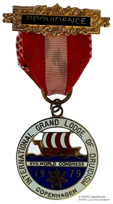 АВЕРС: двойной круг белой эмали с наименованием международной Ложи – International Grand Lodge of Druidism. Copenhagen. В центре изображение парусника с красно белым парусом в море. На фоне моря семи конечная звезда и дата 1979. На белой ленте наименование и номер конгресса – XVII World Congress.