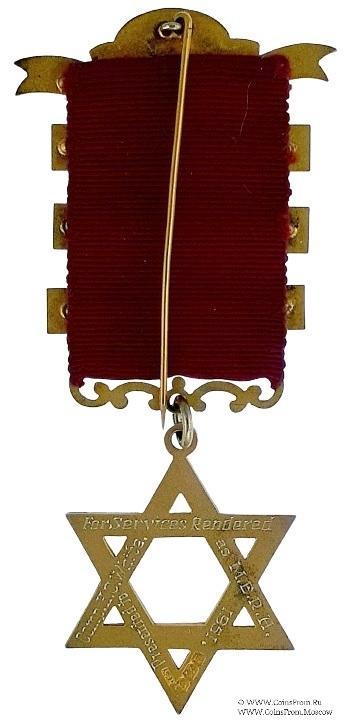 КОЛОДКИ/МЕДАЛЬОН: верхняя колодка в виде ленты с номером Капитула: Royal Arch, Chapter № 25. Нижняя колодка резная. На ленте 3 прямоугольных медальона, украшенных гравировкой и с надписью: MERAD 1953, 1952, 1950.