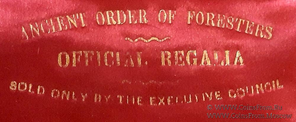 Аверс: лента зелёного цвета овальной формы с наименованием Ордена ANCIENT ORDER OF FORESTERS - Древний Орден Лесников. В центре вязь из букв P.C.R. Past Chief Ranger - Прошлый Главный Рейнджер. Знак украшен цепочкой с карабинами на концах и специальным креплением.