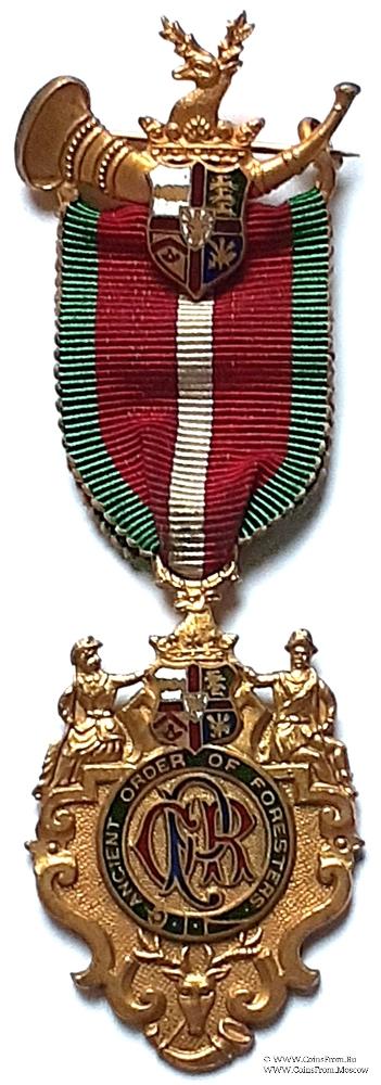 Аверс: в центре знака подвязка из ремня зелёной эмали с наименованием Ордена ANCIENT ORDER OF FORESTERS - Древний Орден Лесников. В центре вязь из букв P.C.R. Past Chief Ranger - Прошлый Главный Рейнджер. Знак украшен: снизу – голова оленя над охотничьим рогом; сверху - щитом с символами Ордена, на котором голова оленя на короне. Шит держат два щитодержателя в виде фигур лесников (охотников). Правый (геральд.) щитодержатель фигура женщины, левый – мужчины. Подножием для щитодержателей служат элементы декора, используемые вокруг знака.