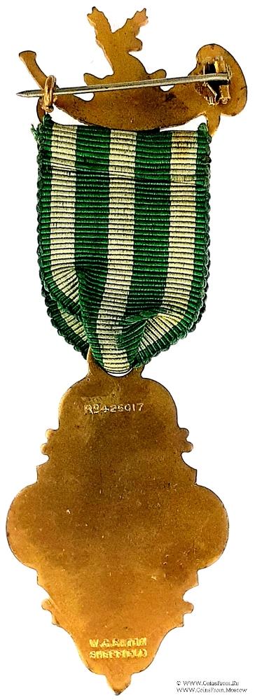 КОЛОДКИ/МЕДАЛЬОН: верхняя колодка в форме охотничьего рога со щитом с символами Ордена, на котором голова оленя на короне. На оборотной стороне булавка для ношения и клеймо производителя W.C. Eatoh Sheffield. Выпуск: Шеффилд.