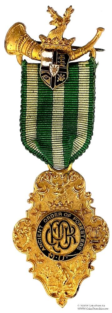 АВЕРС: в центре знака подвязка из ремня зелёной эмали с наименованием Ордена Ancient Order of Foresters - Древний Орден Лесников. В центре вязь из букв P.D.C.R. Past District Chief Ranger – Прошлый Провинциальный (Районный) Главный рейнджер.