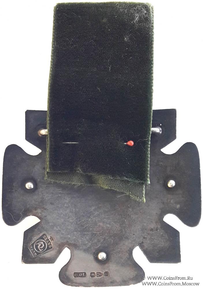 Серебряная медаль в форме креста с золотой вставкой образца 1884 года. Лучи креста украшены чеканкой. Золотая вставка с изображением эмблемы Ордена Лесников.