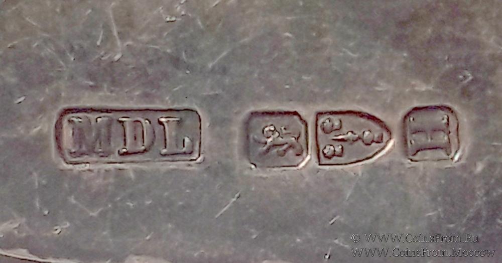 Страна: Англия. Материал: серебро, вставка золото, стекло. Клейма: TRADE MARK AR, MDL, идущий лев, три снопа с мечом H. Выпуск: Честер. Год выпуска: 1891.