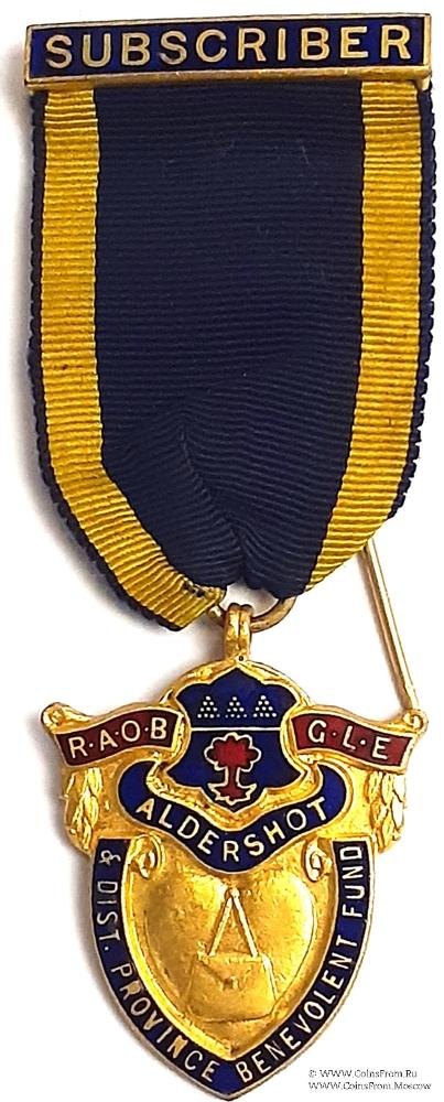 АВЕРС: в форме щита. Верхняя часть украшена лентой синей и красной эмали с аббревиатурой Ордена и наименованием провинции RAOB GLE Aldershot & Dist. По краю нижней части наименование благотворительного фонда - Province Benevolent Fund - Благотворительный Фонд Провинции Aldershot & Dist. В центре изображение кошелька на фоне сердца – символ должности казначея.