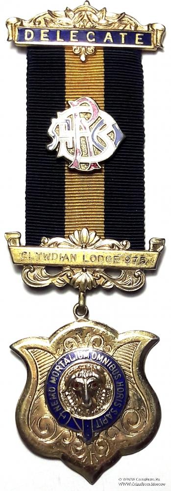 Лента знака чёрная с жёлтой полосой в центре. Металлический медальон на ленте с аббревиатурой ордена RAOB (ROYAL ANTEDILUVIAN ORDER OF BUFFALOES)- Старинный Королевский Орден Буйволов. Верхняя колодка в виде ленты синей эмали с надписью DELEGATE, орнаментом сверху и иглой для носки с обратной стороны. Нижняя колодка в виде лены на фоне орнамента с наименованием Ложи: CLYWDIAN LODGE 975.