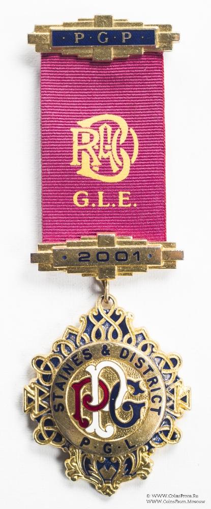 Знак круглой формы в орнаменте из петель и треугольников. По кругу надпись STEINES&DISTRICN PGL (Provincial Grand Lodge) Великая Провинциальная Ложа Провинции Steines. В центре вязь из букв PGP-Provincial Grand Primo.