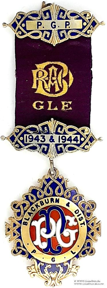АВЕРС: двойной круг с наименованием Провинциальной Великой Ложи (P.G.L. Blackburn&Dist.) в орнаменте из петель и треугольников. В центре вязь из букв PGP на красном фоне - Provincial Grand Primo. Буква Р – синяя и GР – Белые.