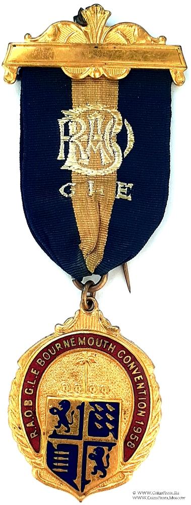 Аверс: в нижней части малый герб в форме щита с клейнодами. На щите через бурелет размещены 5 клейнодов. 4 розы и пальма. Малый герб окружён лентой красной эмали с надписью: RAOB GLE BOURNEMOUTH CONVENTION 1958. Узкий венок в нижней части знака.