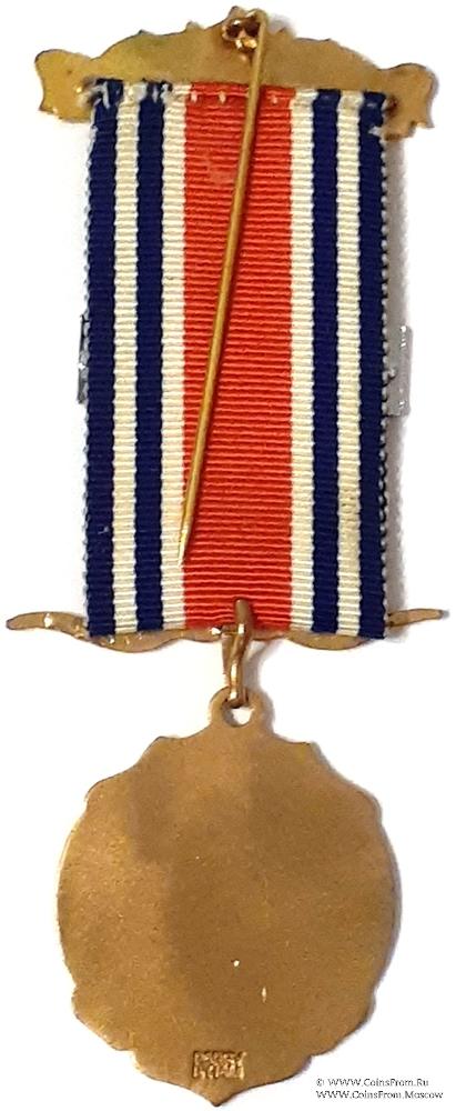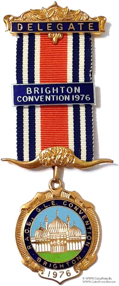 Колодки/медальон: верхняя колодка в виде прямоугольника синей эмали с надписью DELEGATE и орнамен-том сверху. Нижняя колодка в виде рогов буйвола и крючком для знака. На ленте медальон прямоугольной формы синей эмали с надписью: BRIGHTON CONVENTION 1976. (Конвенция 1976 г BRIGHTON).