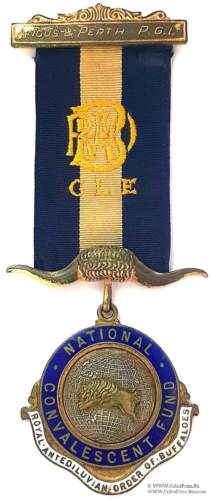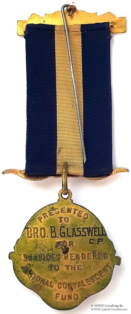 Аверс: круглой формы с изображением в центре буйвола на фоне земного шара. По кругу наименование фонда National Convalescent Fund - Национальный Фонд Выздоровления. Ниже на ленте белой эмали название Ордена Royal Antediluvian Order of Buffalos – Старинный Королевский Орден Буйвола. Реверс: надпись, выполненная в заводских условиях выпуклыми буквами: Presented to Bro. (гравировка B.Glasswell C.P.) for Services Rendered to the National Convalescent Fund. Клейма: нет. Год выпуска 1977. Колодки/медальон: верхняя колодка в виде прямоугольника с наименованием Великой Провинциальной Ложи - Ancus&Perth P.G.L. и орнаментом сверху. Нижняя колодка в виде рогов буйвола. В центре ленты вышивка RAOB GLE. Лента: синяя с жёлтой полосой в центре.