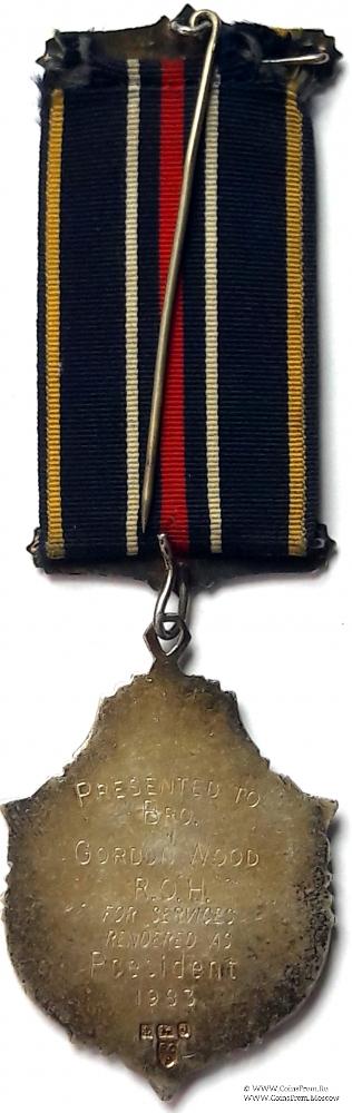 Реверс: гравировка: PRESENTED TO BRO. GORDONWOOD R.O.H. (ROLL OF HONOR – свиток чести) FOR SERVICES RENDERED AS PRESIDENT 1983 - Преподнесён брату GORDONWOOD Рыцарю ордена Свиток Чести за службу в качестве президента 1983. Клейма: FCP, якорь, лев, q. Выпуск: Бирмингем. Год выпуска: 1981.