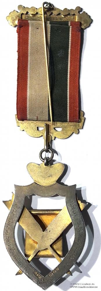 Аверс: резной щит, полый внутри, сверху увенчан короной. Поверх щита накладка из перекрещенных перьев и накладного свитка с надписью Presented to Bro.R.J.Hall C.P. Вручён Брату R.J.Hall Примо.