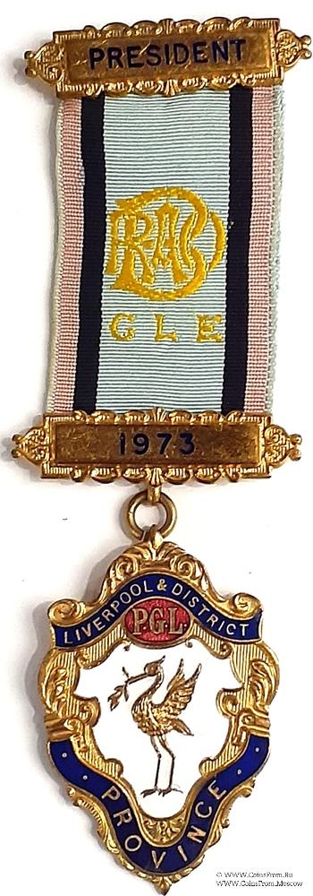 АВЕРС: щитообразной формы, украшенный орнаментом. На лентах синей эмали наименование провинции - Liverpool & District Province, на красном овале PGL – Provincial Grand Lodge – Великая Провинциальная Ложа. В центре изображение аиста с ветвью в клюве.