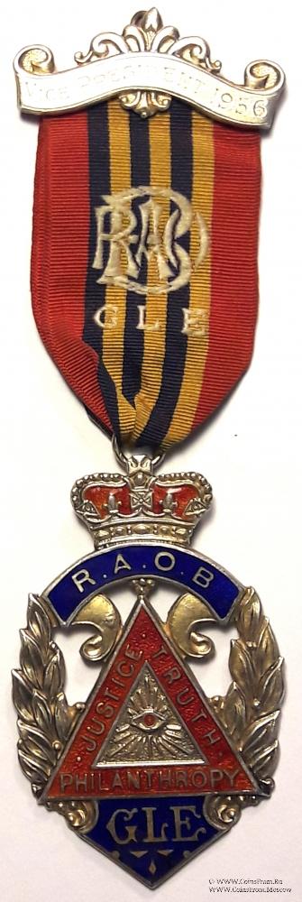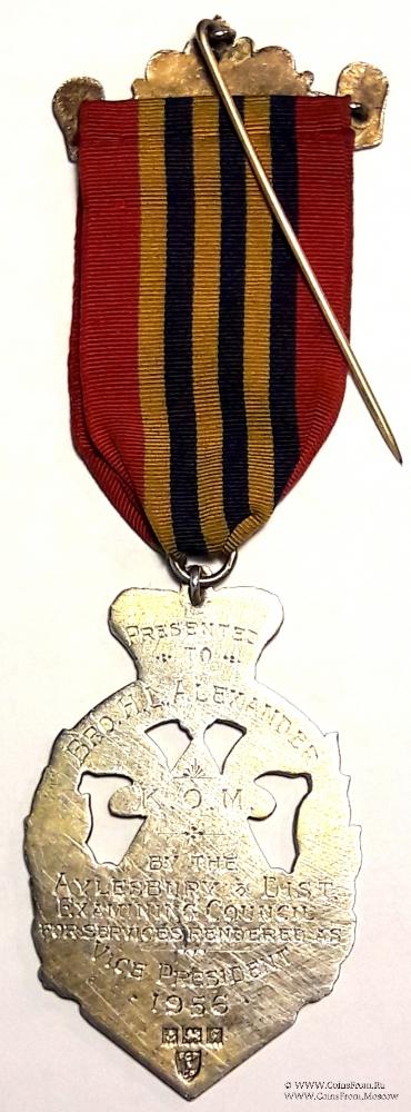 Знак в виде треугольника с боков, окружённого венком. Треугольник красной эмали с девизом Ордена RAOB, внутри которого лучезарная дельта. Выше треугольника, лента синей эмали с аббревиатурой Ордена RAOB, увенчанная короной красной эмали. Низ знака аббревиатура Великой Ложи на синей эмали GLE. Гравировка на реверсе знака: PRESENTED TO BRO. H.L. ALEXANDER К.O.M. BY THE AYLESBURY&DIST. EXAMINING COUNCIL FOR CERVICES RENDERED AS VICE PRESIDENT 1956 – Вручён Брату H.L. ALEXANDER рыцарю Ордена Заслуг в AYLESBURY и районе за оказанные услуги в качестве Вице-Президента экзаменационного Совета.