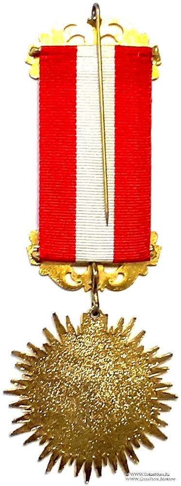 АВЕРС: в виде солнечного диска с лучами синего, красного и золотого цвета. В центре двойной круг с наименованием Ордена – Royal Antediluvian Order of Buffaloes, в центре круга аббревиатура Ордена RAOB.