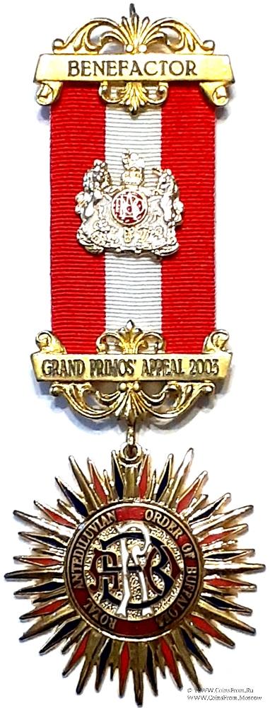 КОЛОДКИ/МЕДАЛЬОН: верхняя колодка в виде ленты, окружённой орнаментом с надписью: Benefactor – благотворитель. Нижняя колодка аналогична по форме верхней с надписью - Grand Primos Appeal 2003. В центре ленты медальон в виде герба с аббревиатурой Ордена в центре.