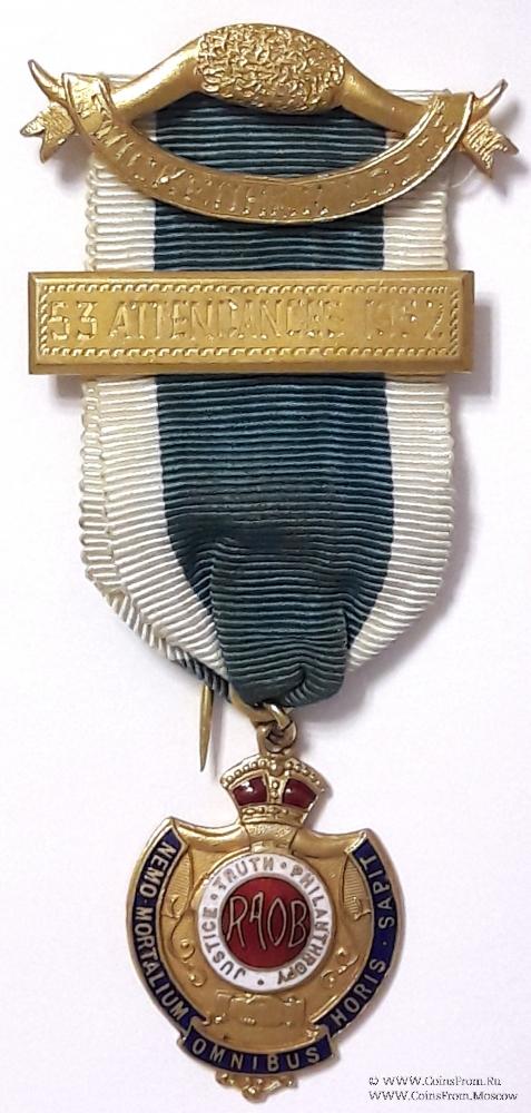 Лента небесно-голубая с белыми полосами по бокам. Верхняя колодка в виде рогов буйвола с перекинутой лентой и надписью названия Ложи TWICKENHAM LODGE. Игла для ношения с обратной стороны. В центре ленты медальон прямоугольной формы с надписью 53 ATTENDANCES 1952 – За посещаемость в 1952-53 году. В низу лента продета непосредственно в кольцо знака.