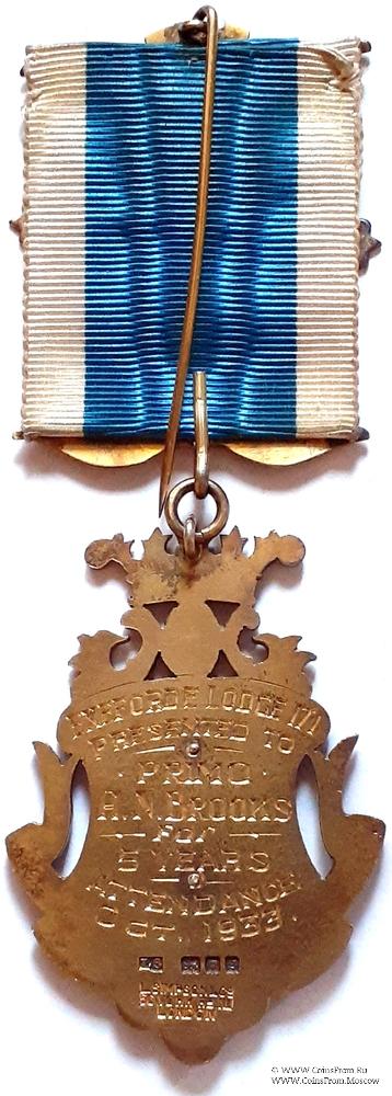 Реверс: гравировка: Exeforde Lodge № 171. Presented to PRIMO A.N. Brooks for 5 Years Attendance. Okt. 1933. (За посещаемость в течение 5 лет). Клейма: LS. L.Simpson&Co, 56 York R№ London, лев, голова леопарда, $. Выпуск: Лондон. Год выпуска: 1933.
