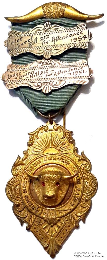 Колодки/медальон: верхняя колодка в форме рогов буйвола На ленте два металлических медальона с гравировками За посещаемость и наименованием и номером Ложи 1951 и 1954 г..