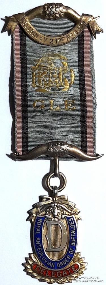 Аверс: в центре знака буква D, окруженная синей лентой с наименованием Ордена ROYAL ANTEDILUVIAN ORDER OF BUFFALOES - Старинный Королевский Орден Буйволов. В верхней части голова бувола с бантом сверху. В нижней части красная лента в листьях с надписью DELEGATE – делегат.