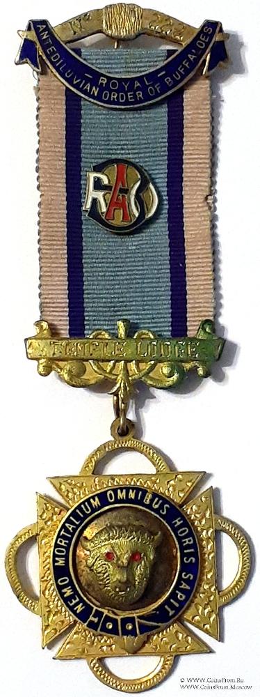 Колодки/медальон: верхняя колодка в виде рогов буйвола, с перекинутой лентой, на которой на-именование Ордена. Верхняя колодка с иглой для носки. Нижняя колодка прямоугольной формы на фоне стилизованного орнамента с крючком для подвески знака и названием Ложи Temple Lodge. В центре ленты медальон с вязью из разноцветных букв аббревиатуры Ордена RAOB.