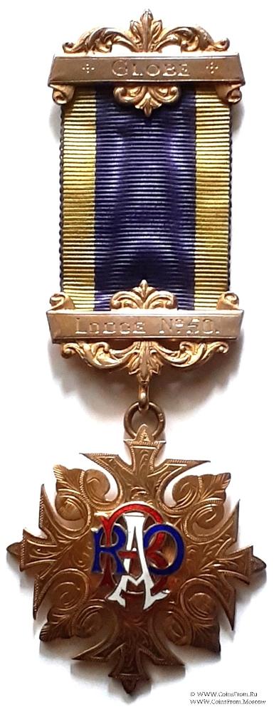 КОЛОДКИ/МЕДАЛЬОН: верхняя и нижняя колодка форме ленты на фоне орнамента. На верхней колодке наименование GLOBE, а на нижней № Ложи LODGE№ 50. Обе колодки серебряные с клеймом STERLING на обороте.