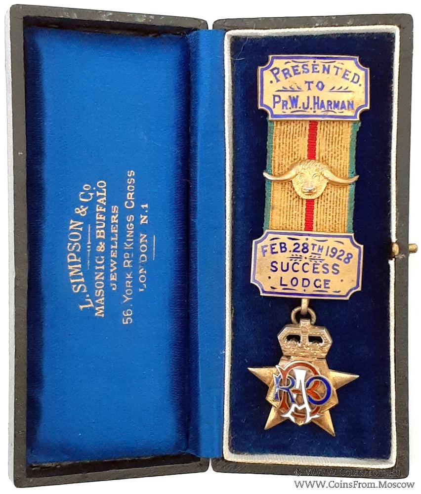 Колодки/медальон: верхняя и нижняя колодки одинаковые в форме прямоугольника с вырезанными углами золотого цвета. Надписи и рамки синего цвета. На верхней колодке – Presented to Pr. W. J. Harman. На нижней колодке – Feb. 28 1928 Success Lodge.