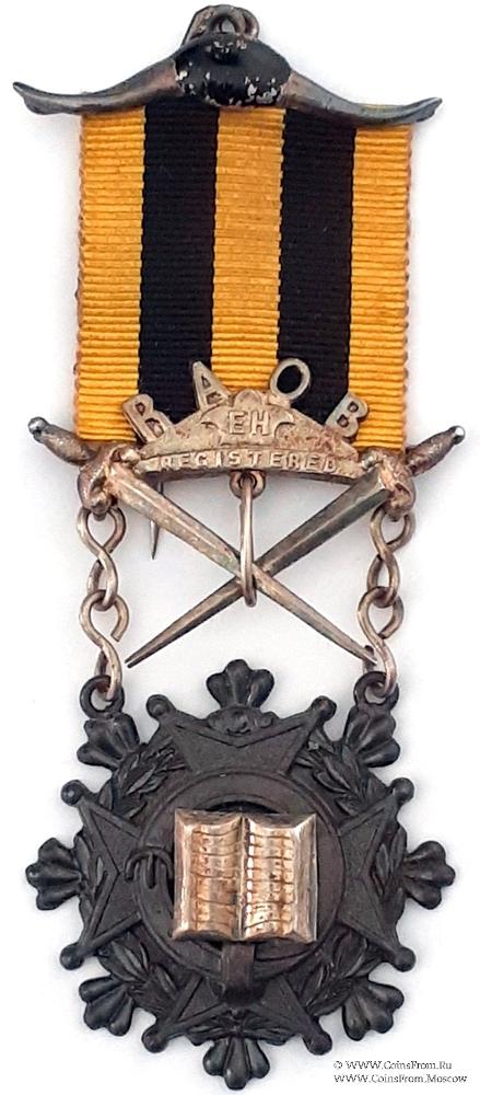Колодки/медальон: верхняя колодка в виде рогов буйвола с кольцом и иглой для крепления на одежде. Нижняя колодка треугольной формы с изображением трилистника и надписью EH Registrered. Сверху вырезные буквы PAOB. По бокам две шпаги остриём вниз и перекрещивающиеся над знаком. Колодка крепится к знаку с помощью двух цепных элементов.