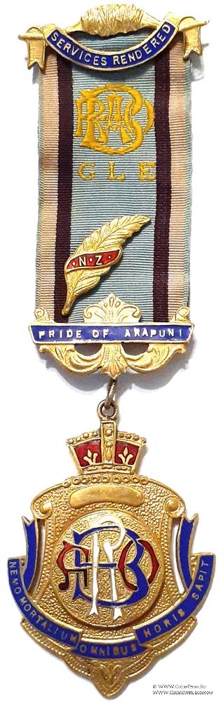 Колодки/медальон: верхняя колодка в виде рогов буйвола с перекинутой лентой синей эмали с надписью: Services Rendered (За оказанные услуги). Нижняя колодка в виде прямоугольника  с орнаментом и наименованием Ложи (Pride of Akapuny). Верхняя - с иглой для ношения, нижняя – с крюком для подвески знака. В верхней части ленты вышивка аббревиатуры Ордена RAOB GLE, в нижней части ленты медальон в форме листа  с красной лентой, на которой буквы N.Z. (Новая Зеландия - Провинциальная Ложа RAOB в Новой Зеландии)