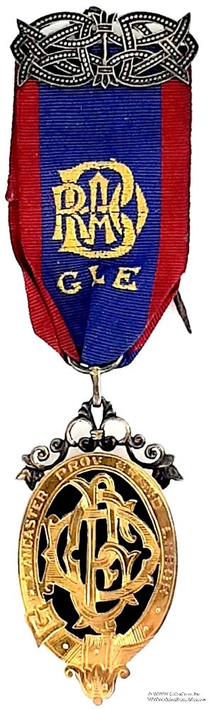 АВЕРС: цвета меди объёмный овал, образованный подвязкой из ремня с наименованием и номером Ложи Lancaster Prov. Grand Lodge. В центре знака накладная вязь из букв аббревиатуры Ордена RAOB. Верх овала украшен орнаментом с кольцом для крепления ленты.