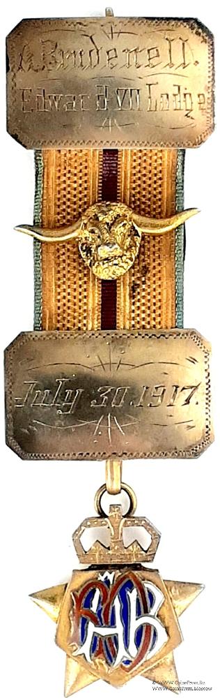 КОЛОДКИ/МЕДАЛЬОН: верхняя и нижняя колодки одинаковые в форме прямоугольника с вырезанными углами золотого цвета. Надписи и рамки выполнены резьбой по металлу. На верхней колодке – A. Bruderrell Edward VII Lodge. На нижней колодке – July 30. 1917. В центре ленты металлический медальон в виде объёмной головы буйвола.