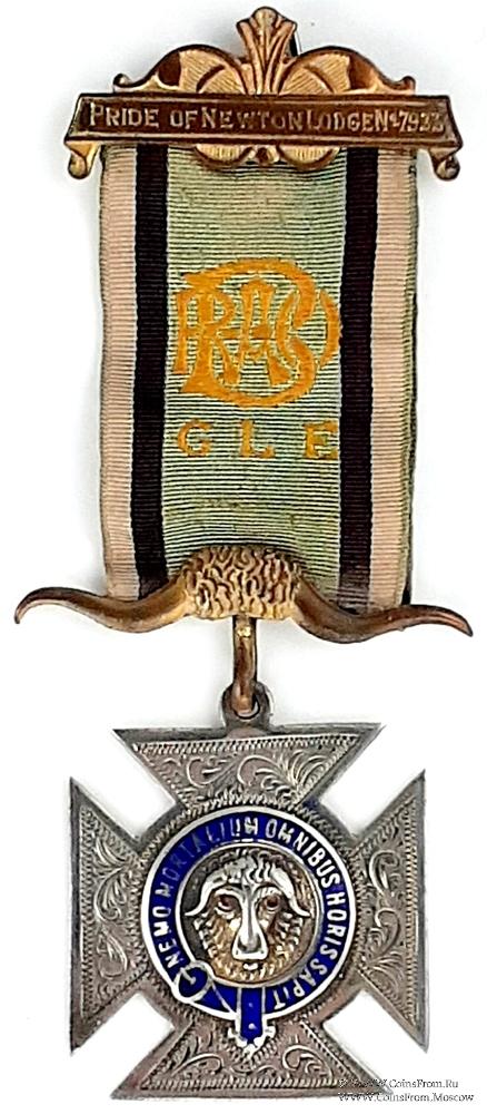 КОЛОДКИ/МЕДАЛЬОН: верхняя колодка в виде ленты на фоне стилизованного орнамента с наименованием и номером Ложи (Pride of Newton Lodge № 7933). Нижняя колодка в форме рогов буйвола.